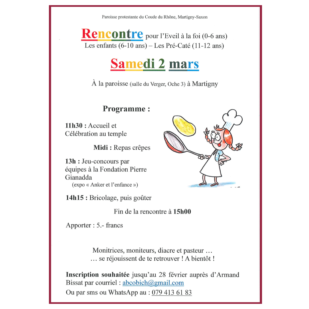 Salles du coude du Rhône Rue d'Oche 3, Martigny, ValaisMinistre : Armand Bissat Concours de biscuits. Merci à ceux qui le souhaitent d'apporter des biscuits. Menu du repas : chasse